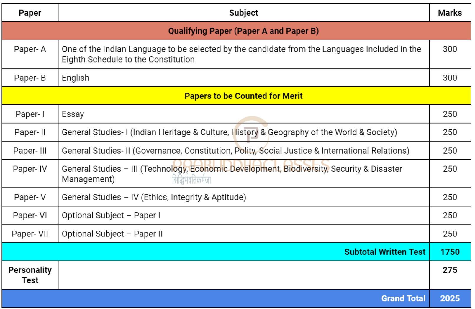 - Papers VI and VII: Optional Subject Papers I and II (250 marks each) – candidates choose one optional subject from a list of subjects.